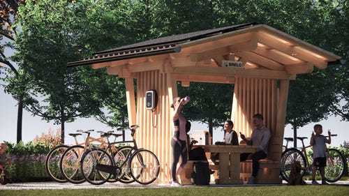 Eine Break & Load Station, die nicht nur Fahrräder, sondern auch Menschen auftanken lässt.